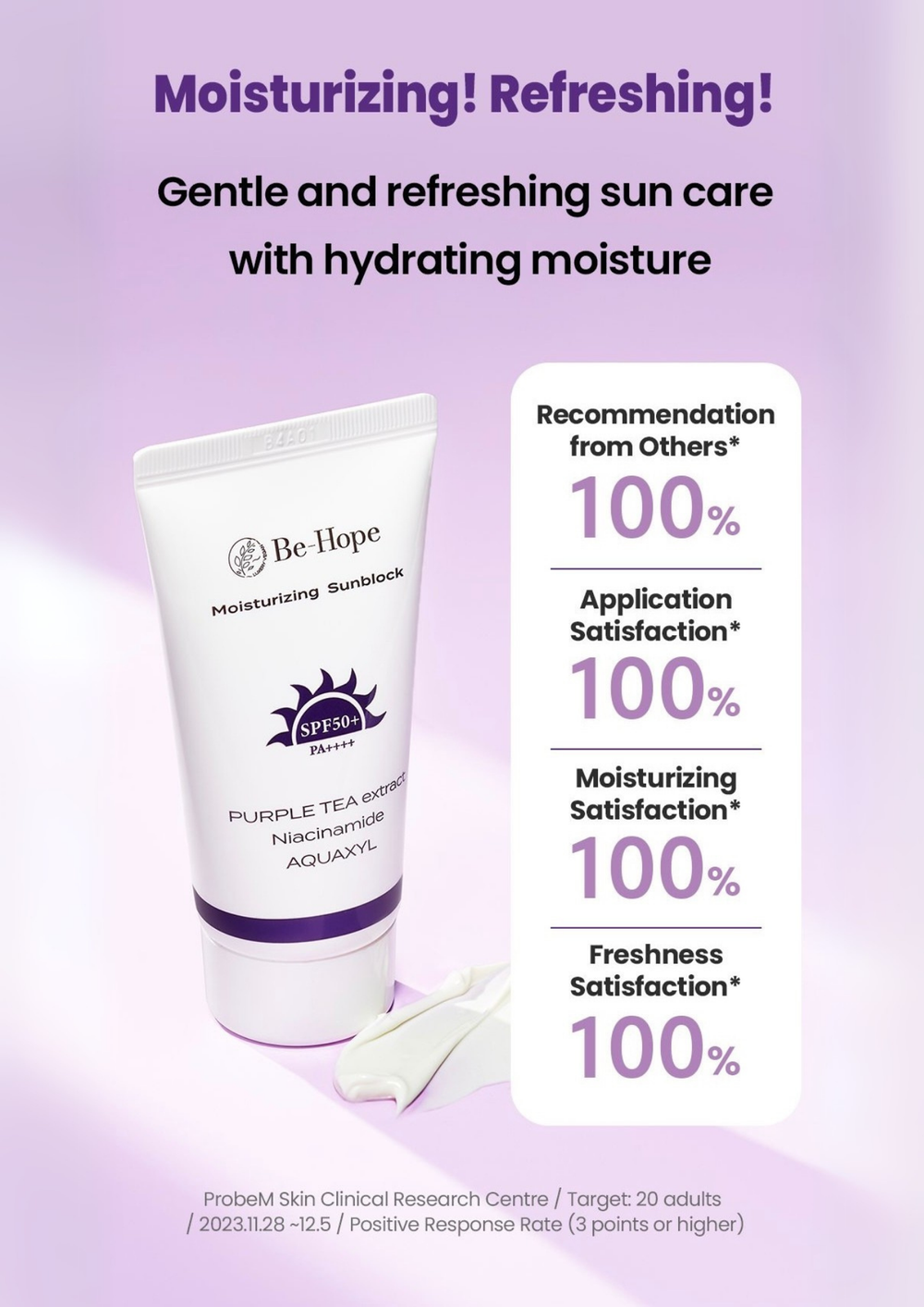 Hydratační opalovací krém Be -Hope Moisturizing Sunblock SPF50+ PA++++ je opalovací krém, který chrání pokožku před UVA a UVB zářením, hydratuje a zlepšuje texturu pleti .