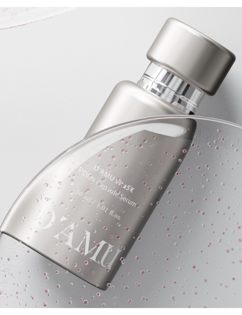 D'AMU je unikátní high-end kosmetika z Koreje, "Premium Vegan Art Beauty Cosmetics". Unikátní Vita5X Complex zahrnuje vše potřebné pro jedinečnou a komplexní péči o pokožku: vitaminy A, P, C, E, B5 a B3, "topické vitaminy" pro dokonalou péči o pokožku. Sérum s rostlinným PDRN obsahuje unikátní kapsle, naplněné PDRN - ty se otevřou po kontaktu s pokožkou a poskytnou tak hlubokou a účinnou péči. Sérum dále obsahuje kyselinu askorbovou (vitamin C), niacinamid, adenosin, retinyl palmitát (vitamin A), pupečník asijský, panthenol, nízkomolekulární kyselinu hyaluronovou a ceramidy, glutathion. Pro zářivou a zdravou pokožku a eliminaci rozšířených pórů. Pokožka bude vypadat mladě, svěže, hydratovaně a sérum rovněž dodá na objemu povadlé pokožce.