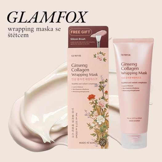 SUPERAKCE! GLAMFOX Ginseng Collagen Wrapping Mask je revoluční krémová maska s vysokým obsahem kolagenu a ženšenového extraktu, která poskytuje hloubkovou hydrataci, zlepšuje elasticitu pleti a také výrazně redukuje rozšířené póry. Unikátní wrapping efekt vytváří na pokožce jemný film, který uzamyká vlhkost a zanechává pleť svěží, hladkou a rozzářenou.