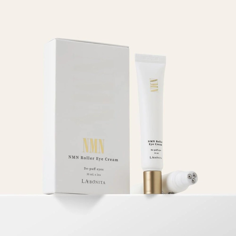 La Bonita krém s komplexem NMN pro intenzivní snížení otoků, vaků a vrásek kolem očí se speciálním, tříbodovým masážním rollerem.