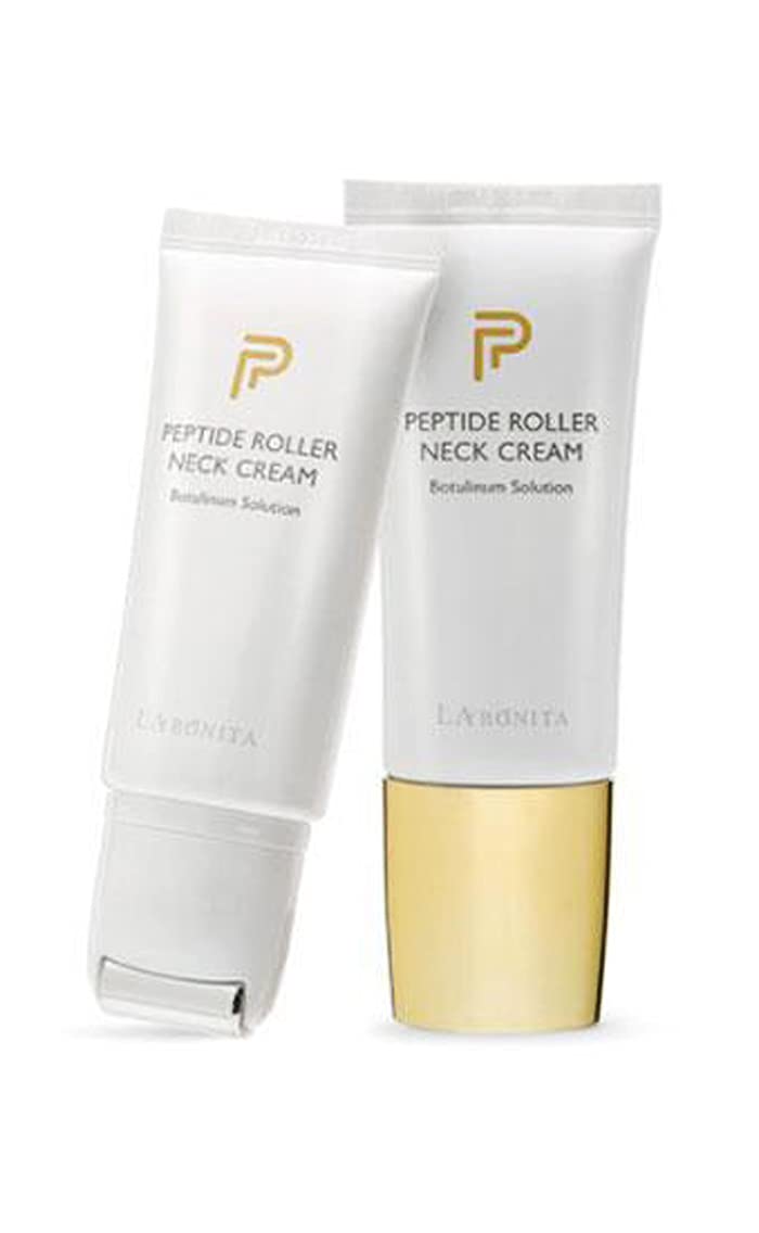 Prémiový krém na krk od korejské značky LA BONITA tubová lahvička s krémem má speciální válečkový nástavec, který pomáhá nanášet produkt rovnoměrně a poměrně ekonomicky a také pomáhá dodatečně chladit pokožku, aby se zlepšilo vstřebávání užitečných složek. Přípravek obsahuje speciální komplex peptidů s botoxovým efektem, který napomáhá uvolnění svalů, vyhlazování pokožky. Krém dále obsahuje složky pro intenzivní hydrataci a výživu, která umocňuje a prodlužuje vyhlazující efekt. Krém obsahuje: mastné kyseliny, komplex peptidů (včetně nejcennějších anti-aging Copper Tripeptide a Acetyl Hexapeptide), bambucké máslo, niacinamid, adenosin, levandulový olej, kyselinu hyaluronovou. Toto složení je mixem moderních komponentů pro dosažení požadovaného efektu na tenké pokožce krku. Krém pomáhá vyhlazovat vrásky a „venušiny prsteny“, posiluje pokožku a stimuluje tvorbu kolagenu a elastinu.
