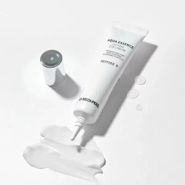 Medi-Peel Peptide 9 Aqua Essence Lifting Eye Cream je luxusní a moderní oční krém.. Pomáhá omlazovat a vyživovat jemnou pokožku kolem očí. Obsahuje účinnou směs peptidů, která pomáhá redukovat výskyt jemných linek, vrásek a dalších známek stárnutí. Kromě peptidů obsahuje oční krém řadu hydratačních a vyživujících složek, jako je kyselina hyaluronová, glycerin a bambucké máslo.. Tyto složky společně pomáhají hydratovat a napínat pokožku, stejně jako zlepšují pevnost a pružnost.