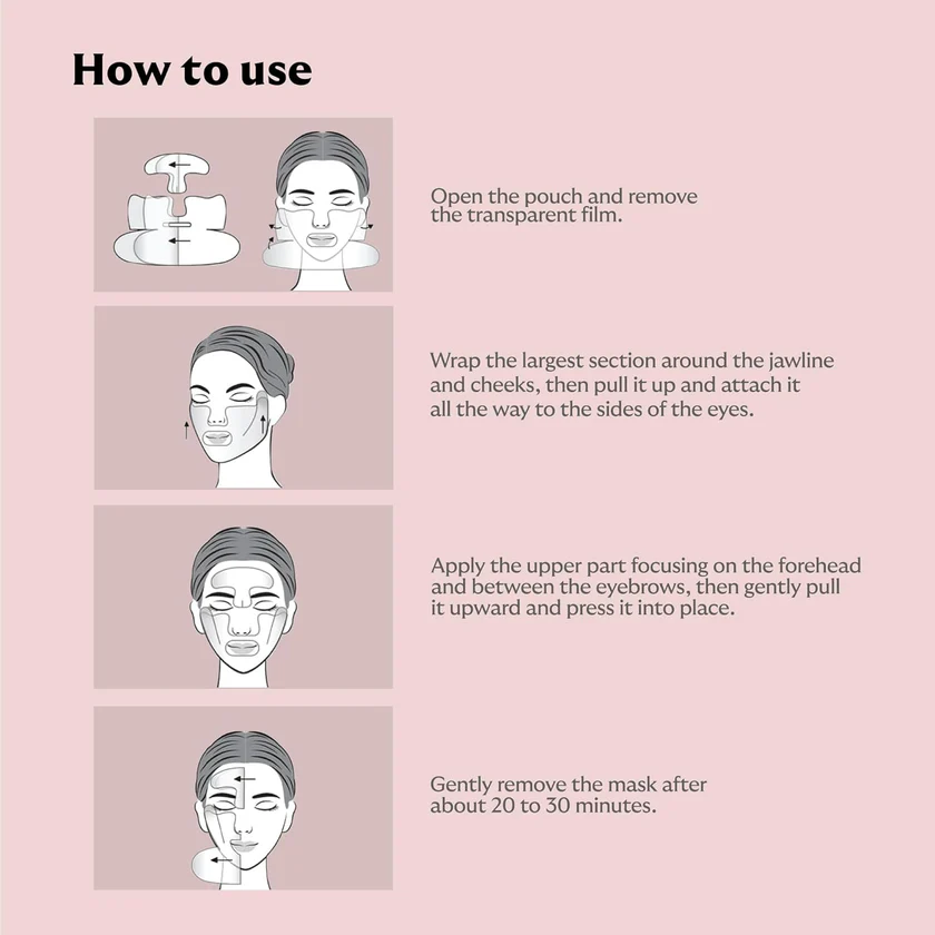 Otevřete sáček a odstraňte průhlednou fólii. Přitiskněte stranu s odstraněnou fólií ke kůži, začněte od spodní části, zaměřte se na tváře a linii čelisti a zajistěte vytažením nahoru k očím. Naneste horní část masky na čelo a mezi obočí a jemně ji nadzvedněte. Po 20-30 minutách masku sejměte.