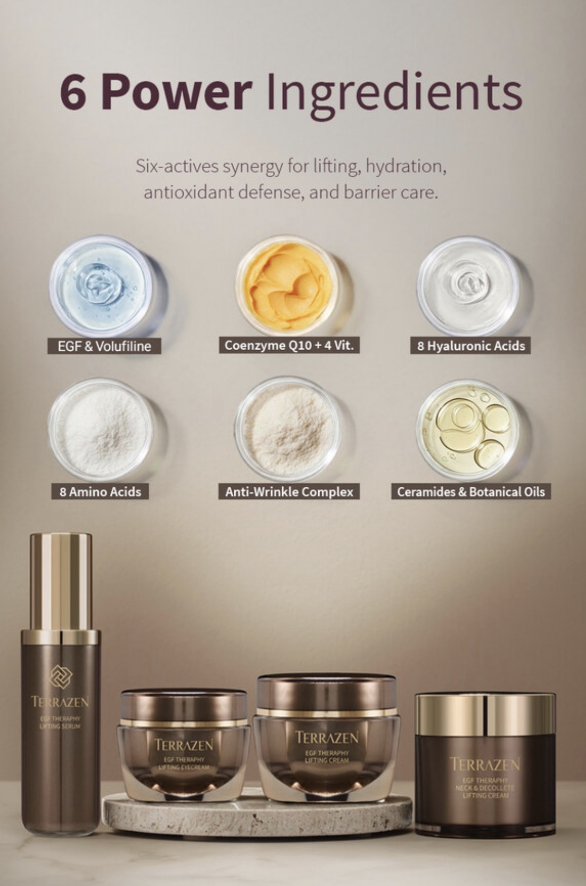 • TERRAGEN EGF Therapy Lifting Line je prémiová péče o pleť, která díky silné synergii EGF a Volufilinu dodává pleti objem a elasticitu z hloubky.