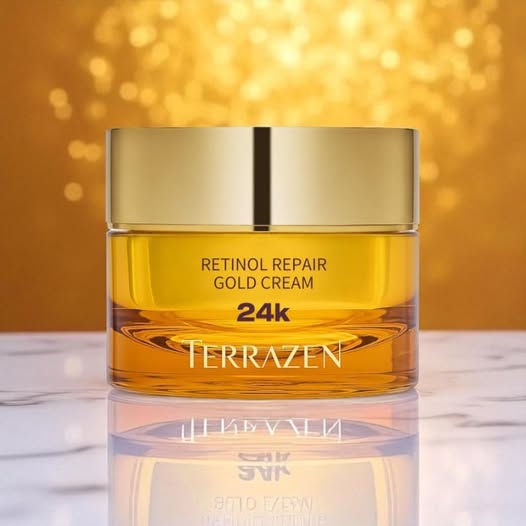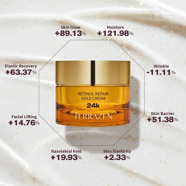 Světový premiéra - nejnovější produkt z korejské značky TERRAZEN Retinol Repair Gold krém dokonalý bojovník proti vráskám, posilování tvorby kolagenu, zpevnění pokožky, obnova kožní bariéry, zdravý lesk, bělění. Krém na podporu tvorby kolagenu a regeneraci s obsahem retinolu, 6 peptidů, adenosinu a 24rátového zlata doplňuje energii pleti, poskytuje trojitou péči o vrásky a hloubkově doplňuje vlhkost a živiny, posiluje kožní bariéru pro dlouhodobě zdravou a hydratovanou pleť. Krém je koncipován jako komplexní anti-aging péče, která cílí na hydrataci, redukci vrásek a sjednocení tónu pleti. Kombinace retinolu a bakuchiolu zajišťuje účinné omlazení, zatímco bohatá směs peptidů a niacinamidu pleť zpevňuje a rozjasňuje.